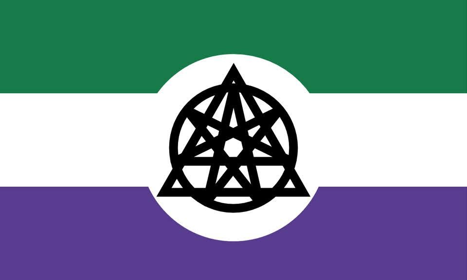 The Nonhuman Unity Flag, combining symbols associated with otherkin, therian, and voidpunk identities. [Synanthrope, copyleft]
